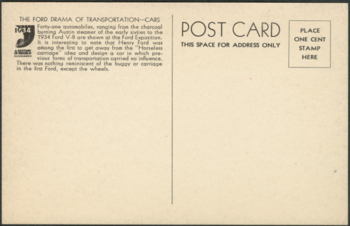 This 1934 Century of Progress postcard illustrates the 1861 Austin steam car in the upper left. The reverse promotes the Ford Motor COmpany's V-8 at the Ford Exposition.